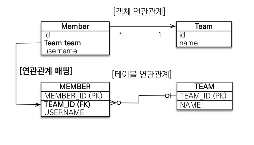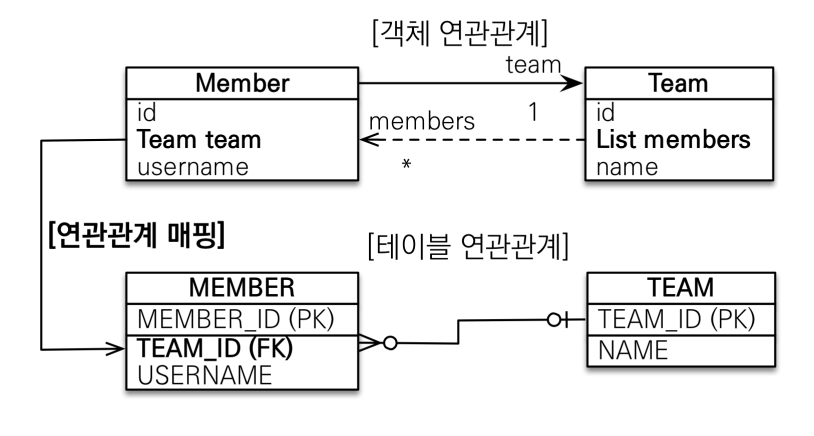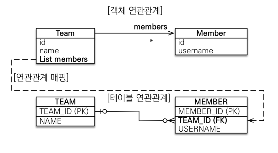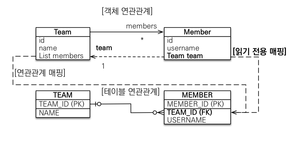 위 그림을 보면 팀 엔티티의 Team, members로 회원 테이블의 TEAM_ID 외래 키를 매핑한다.