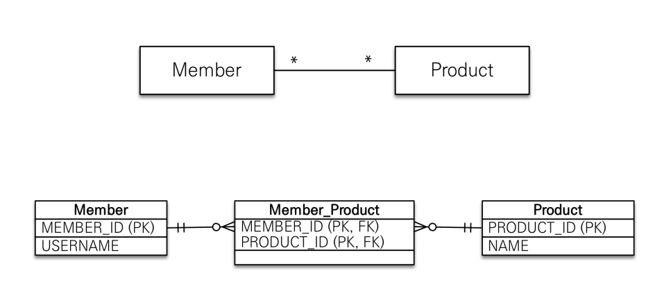 관계형 데이터베이스는 정규화된 테이블 2개로 다대다 관계를 표현할 수 없다.