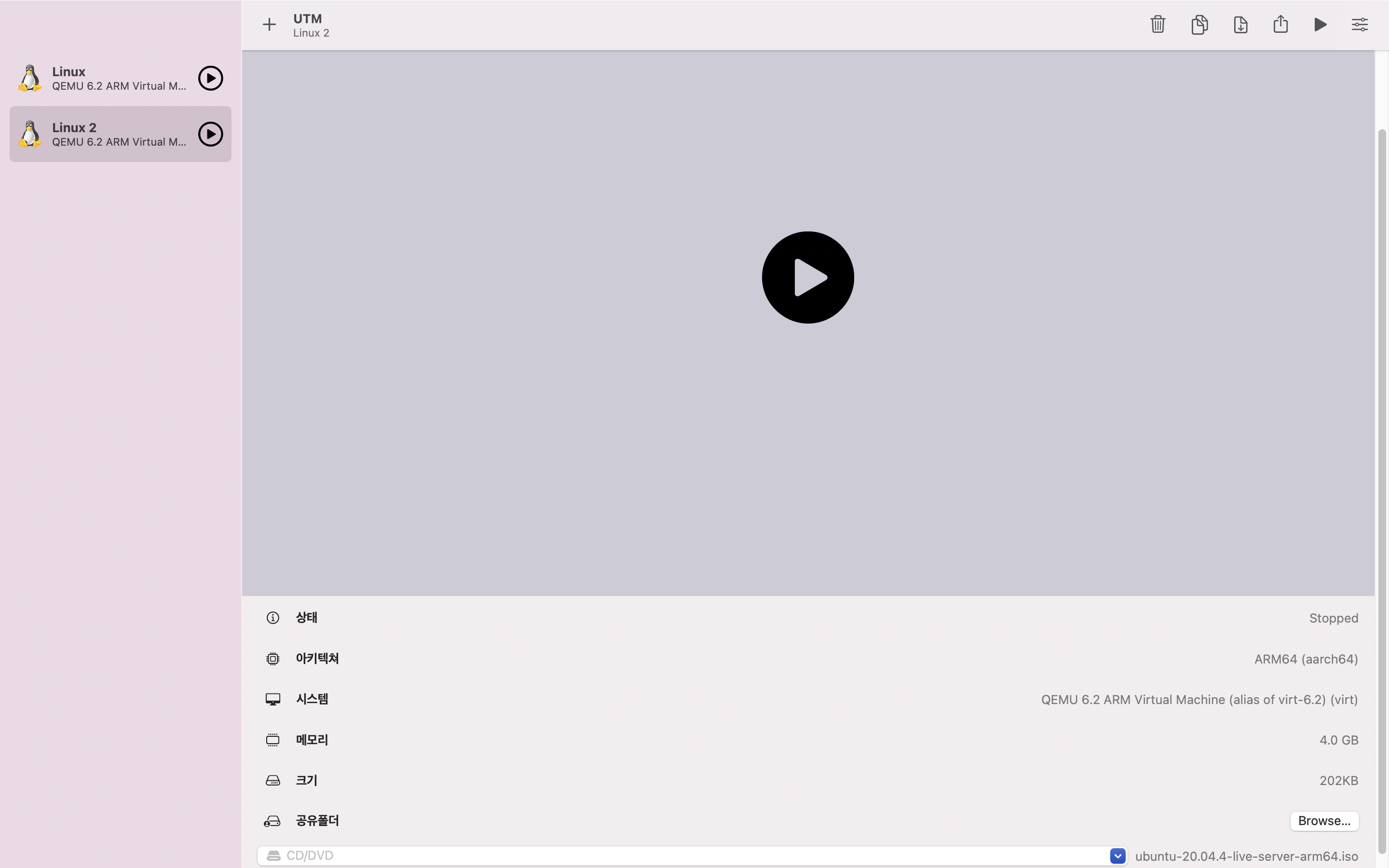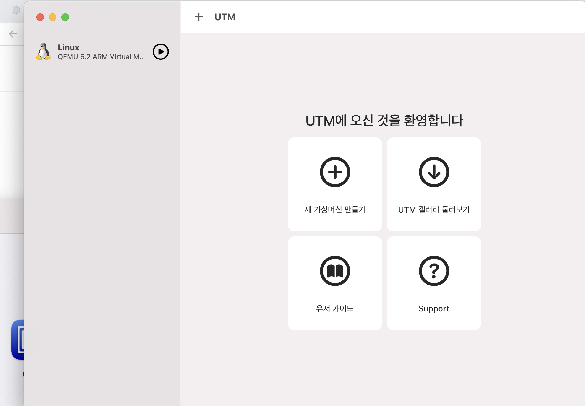 이렇게 UTM을 사용해 가상 컴퓨터를 만들었습니다. 이제 작동시키고 한 번 리눅스 설정을 해보겠다.