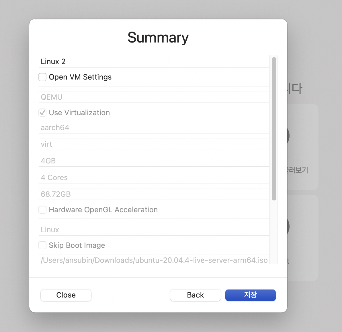 이제 저장을 누르면 새로운 Linux 가상 컴퓨터가 만들어졌다. 아래와 같은 이미지와 동일하다면 잘 된 것이다.