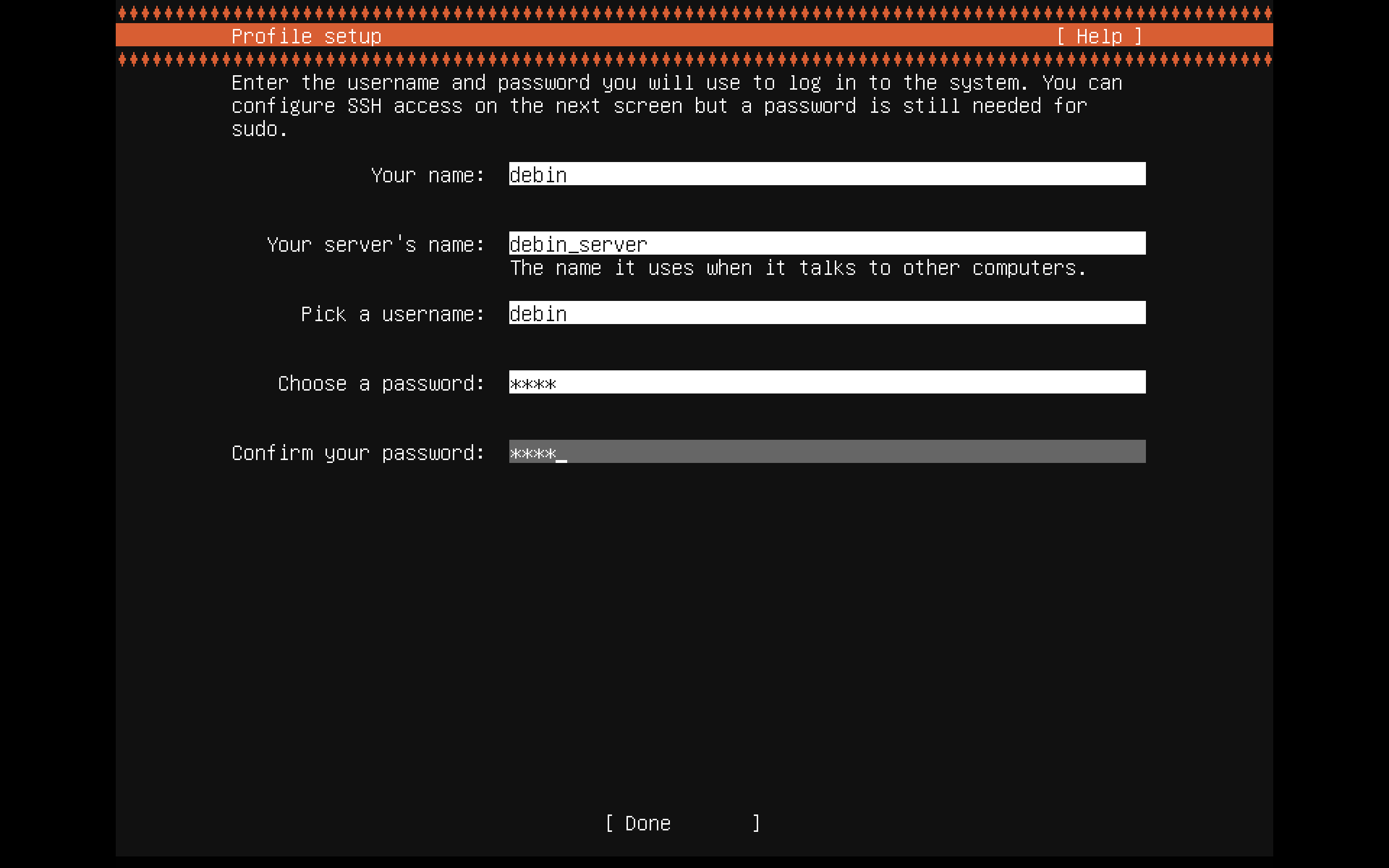아래 페이지는 회원 프로필을 설정하는 작업을 진행한다. 비밀번호는 1234로 진행했다. 다시 Done에서 엔터를 누른다.