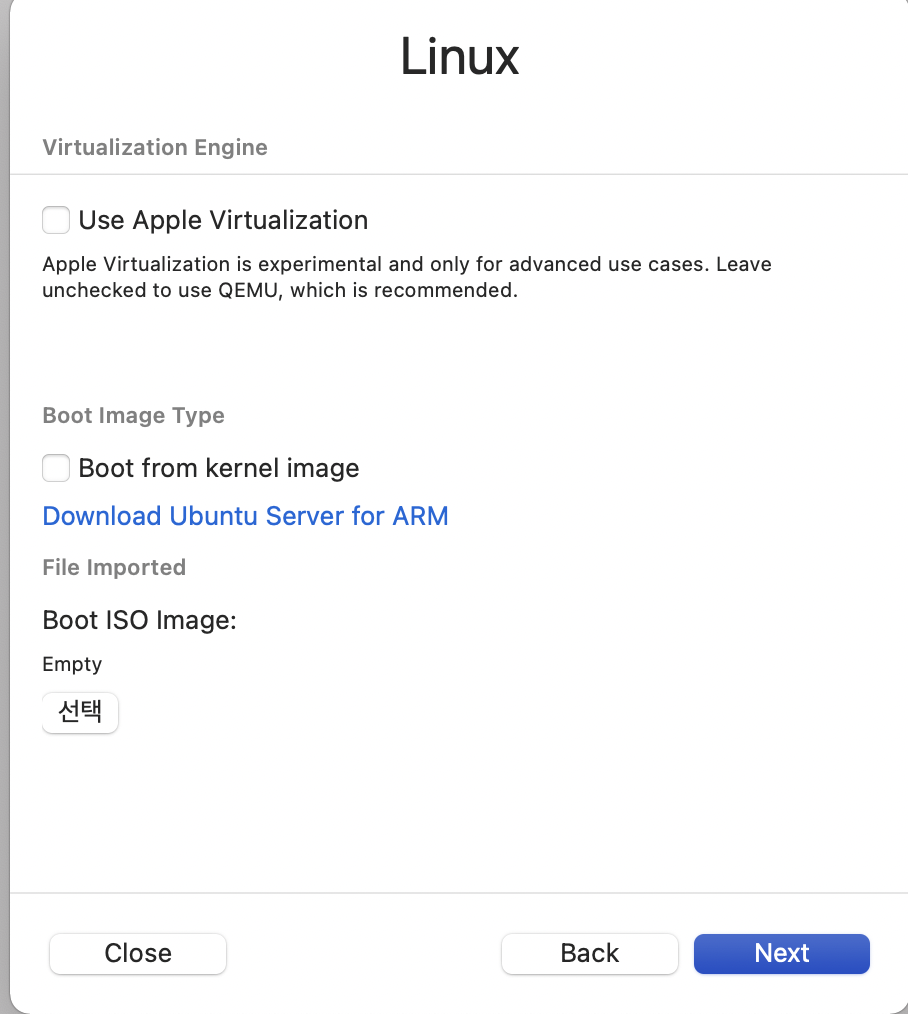 본인은 아무것도 체크하지 않고 Boot ISO Image에 우리가 다운로드한 Ubuntu for ARM을 선택해주었다.