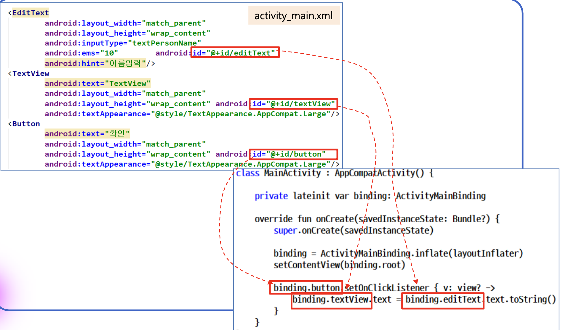 - ViewBinding 또는 findViewById 메소드 사용을 권고한다.