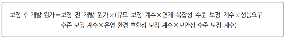 규모와 유형도 다양하고, 연계 복잡성 수준, 성능요구 수준, 운영 환경 호환성, 보안성 수준이 프로젝트의 특성에 따라 다르다. 실제 개발 비용에 영향을 미치므로 이들에 대 해 보정 계수를 정하고 이를 반영해 보정한 후 개발 원가를 구해야 한다.