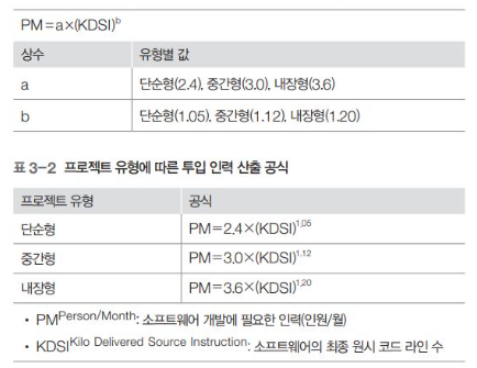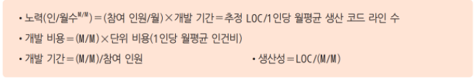 - 먼저 완성될 소프트웨어의 크기(라인 수 LOC)를 추정하고 이를 준비된 식에 대입해 개발에 필요한 M/M을 예측한다