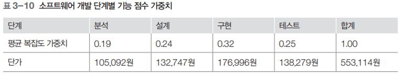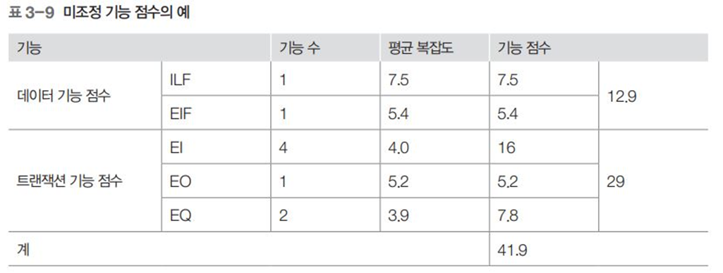 - 사업 초기에는 기능 점수를 산정할 수 있을 만큼 자료가 충분하지 않으므로 평균 복잡도 가중치에 의존해 기능 점수를 산정한다.
