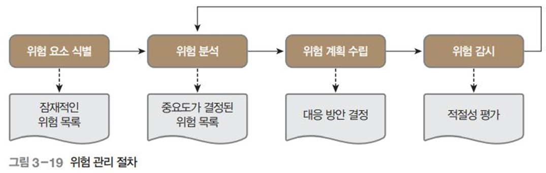 - 위험 계획 수립 : 위험을 관리하기 위한 전략을 찾는다. 위험 대응 방안을 잘 세워야함.