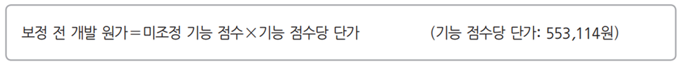 보정 전 개발 원가는 앞에서 구한 미조정 기능 점수에 기능 점수당 단가를 곱해 계산한다.
