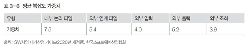 - 과거에 수행한 소프트웨어의 기능 점수 산정 결과를 분석해 5가지 유형에 적용된 복잡도를 계산한 가중치의 평균값