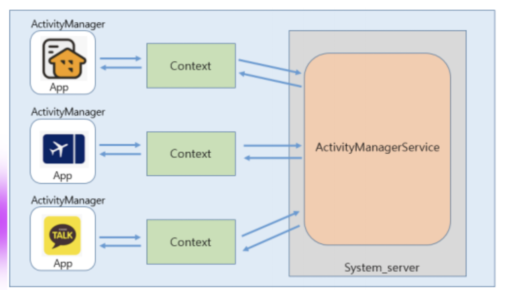 Context는 자신의 application의 키/값을 가지고 ActivityManagerService에 접근하여 application에 관한 전역 정보 획득 - 시스템에서 제공하는 메서드를 application이 사용할 수있도록 한다.