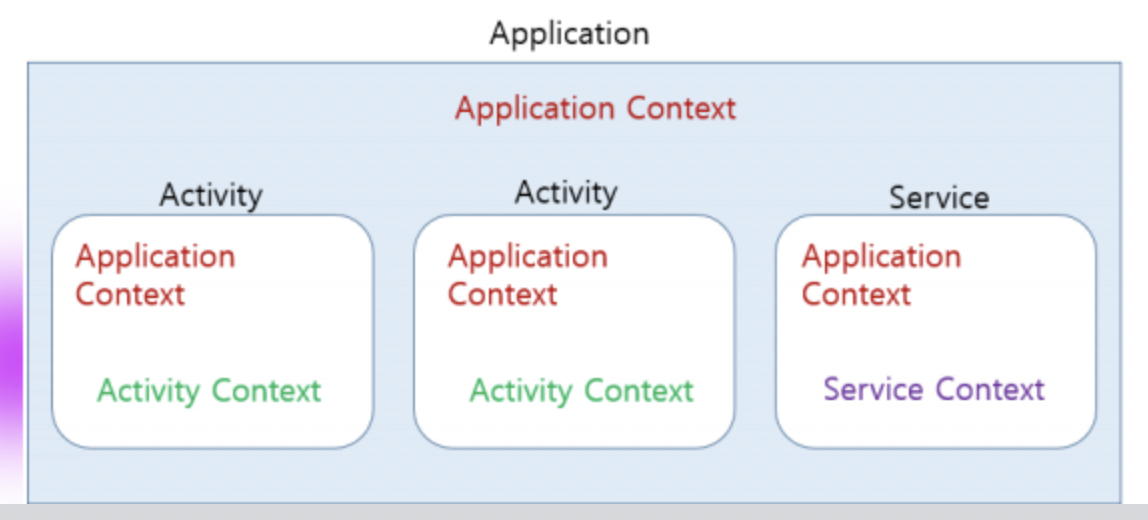- Context 클래스는 추상 클래스로, Application, Activity, Service는 Context 클래스를 상속 받아 Context 객체를 이용한다.