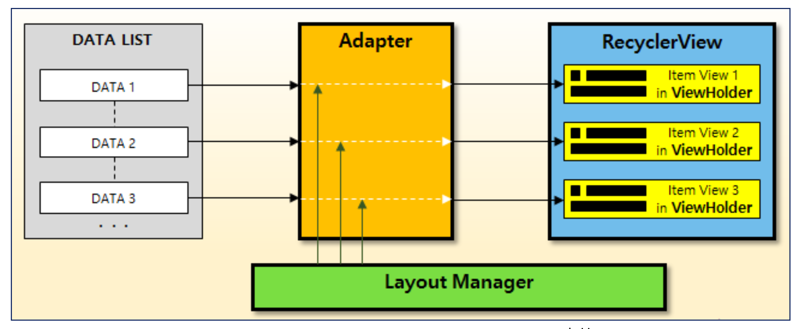 - 즉, 어댑터에서 데이터도 관리하고 눈에 보이는 각 아이템을 위한 뷰 객체도 만들어내는 역할을 수행한다.