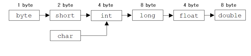 - byte(1byte) -> short(2byte) -> int(4byte) -> long(8byte) -> float(4byte) -> double(8byte)