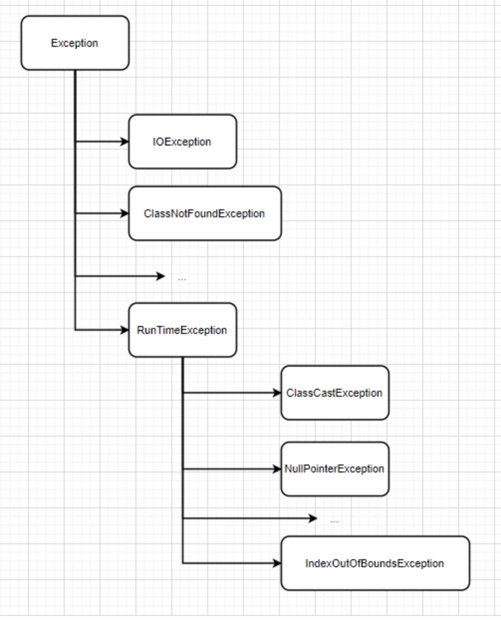 - RuntimeException 클래스와 그 자손 클래스들을 RuntimeException 클래스들이라 하고, 제외한 나머지 클래스들을 Exception 클래스들이라고 하겠다.
