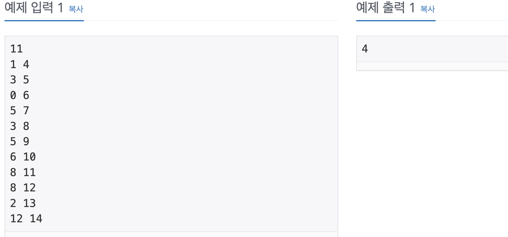 - 많은 블로그 글과 활동 선택 문제 글을 보았는데, 이번 문제는 종료 시간을 기준으로 정렬을 해야 한다.
