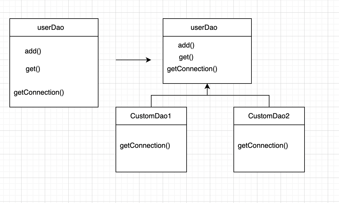 userDao를 상속한 커스텀 Dao에서는 부모 클래스의 추상 메서드인 getConnection()을 오버라이딩해 기능을 자유롭게 확장할 수 있다.