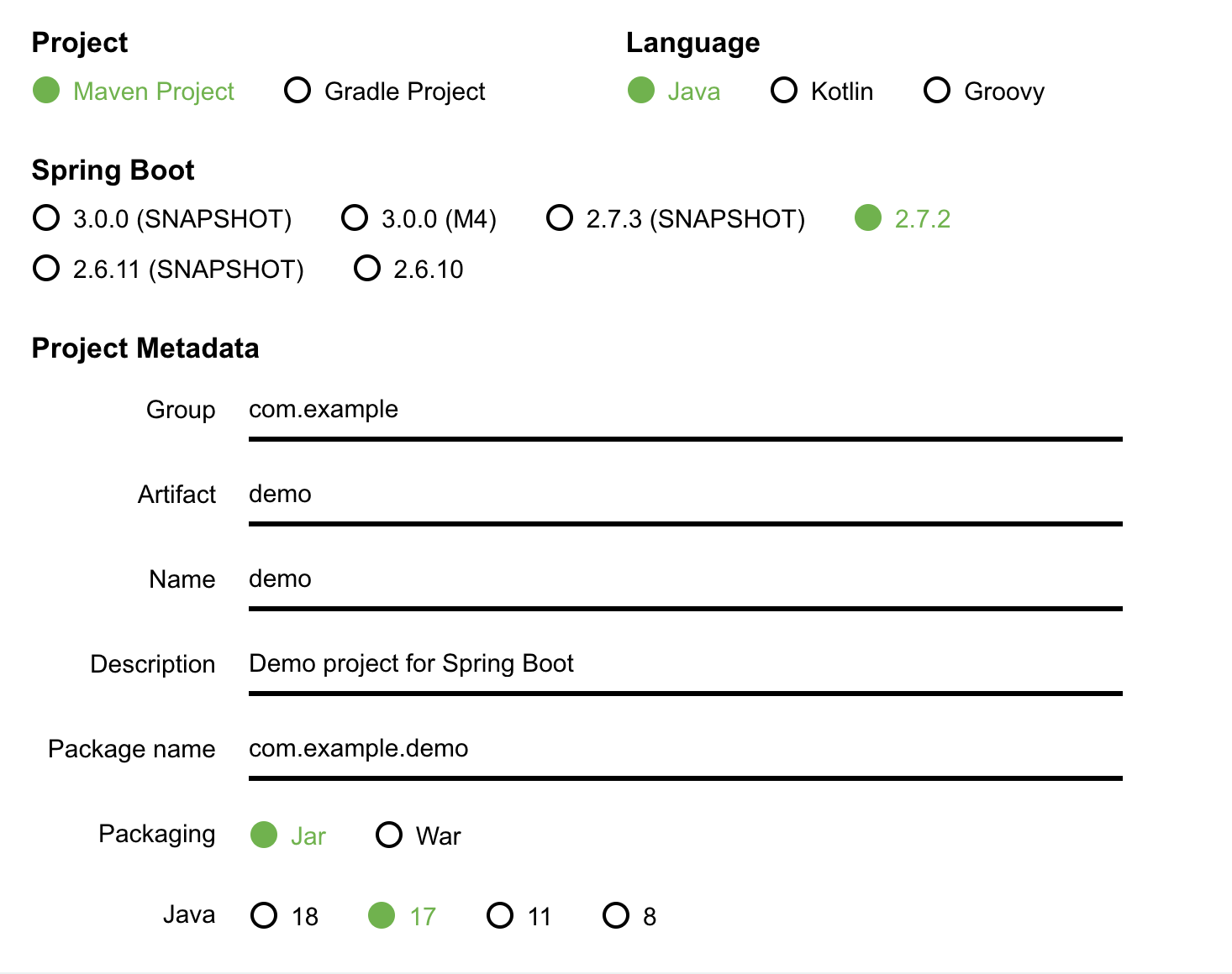 https://start.spring.io/ 여기에서 스프링 프로젝트를 만든다. 들어가면 다음과 좌측면에 같은 화면이 나온다.