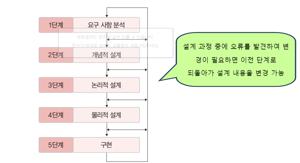 요구 사항 분석, 개념적 설계, 논리적 설계, 물리적 설계, 구현 순서로 이루어진다.