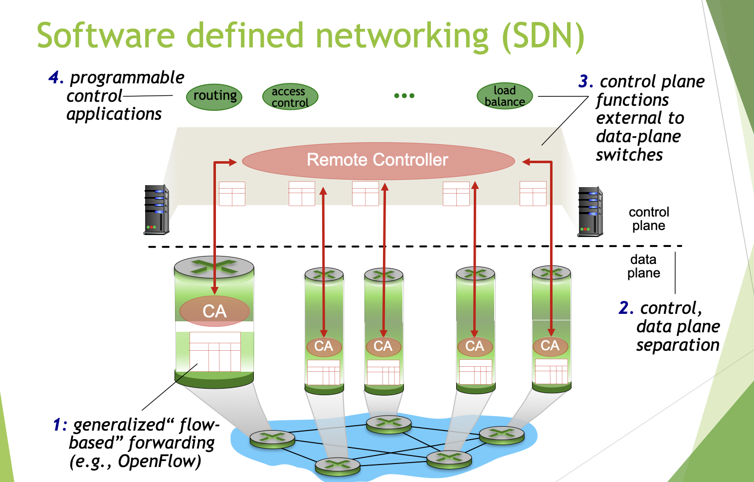 - 네트워크 제어 기능이 데이터 평면 스위치 외부에 존재: 전통적인 라우터들과는 달리, 이 소프트웨어가 네트워크 스위치로부터 멀리 떨어진 별도의 서버에서 수행된다.