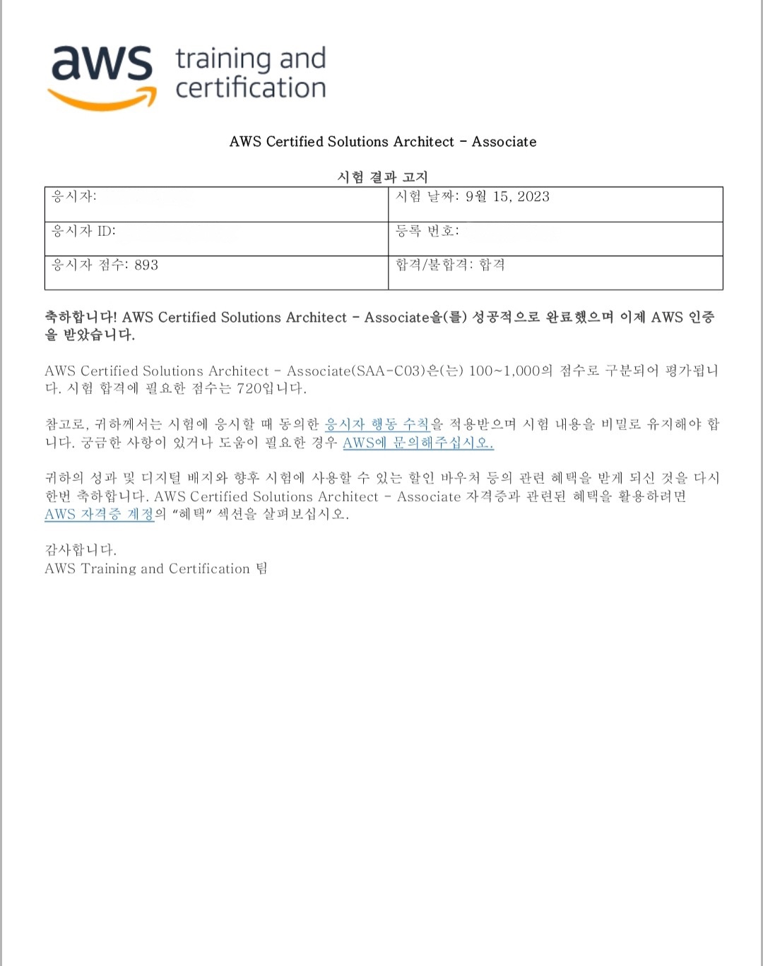 오늘은 AWS Certified Solutions Architect - Associate(SAA-C03) 취득에 대한 후기를 남겨보겠습니다.