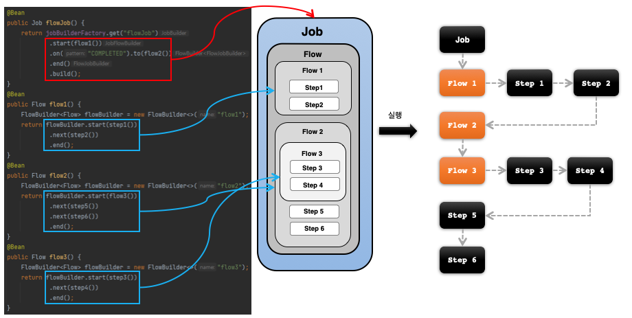 - FlowBuilder를 사용해서 생성하여 Transition과 조합하여 여러 개의 Flow 및 중첩 Flow를 만들어 Job을 구성할 수 있다.