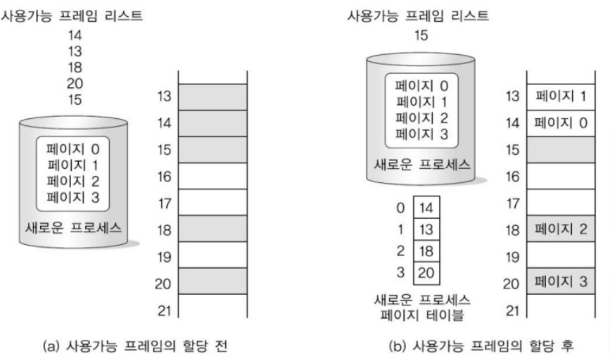 페이지 스케줄링 - 장기 스케줄러는 프로세스 (n개 페이지)를 메모리에 할당하기 위해 n개 프레임이 준비되면 스케줄링한다. 그림과 같다.