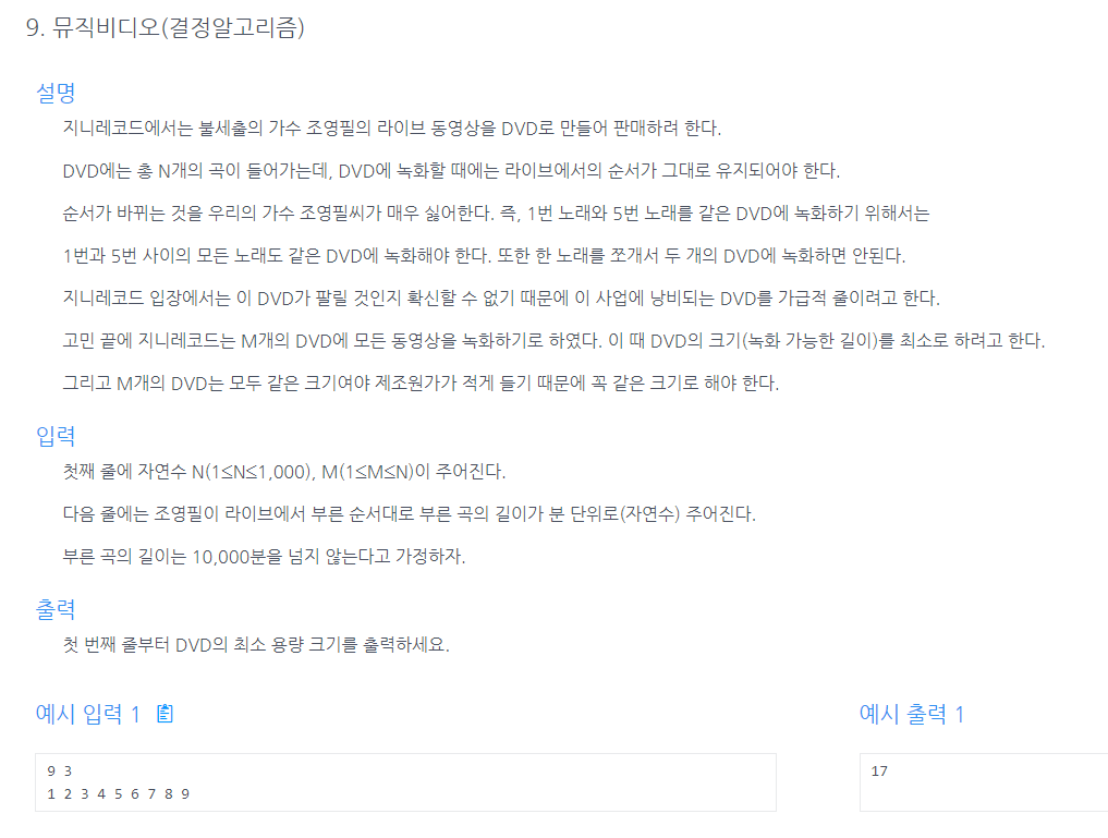 힌트 : 3개의 DVD용량이 17분짜리이면 (1, 2, 3, 4, 5) (6, 7), (8, 9) 이렇게 3개의 DVD로 녹음을 할 수 있다.
